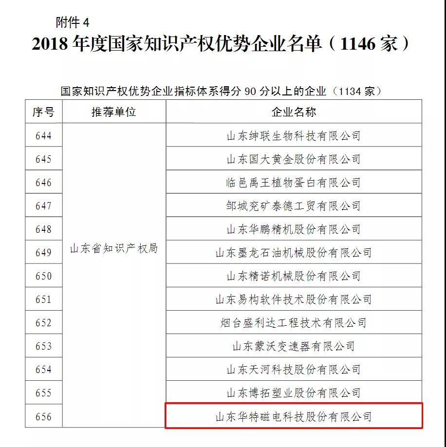 山東華特磁電科技股份有限公司榮獲2018年度國家知識產權優勢企業